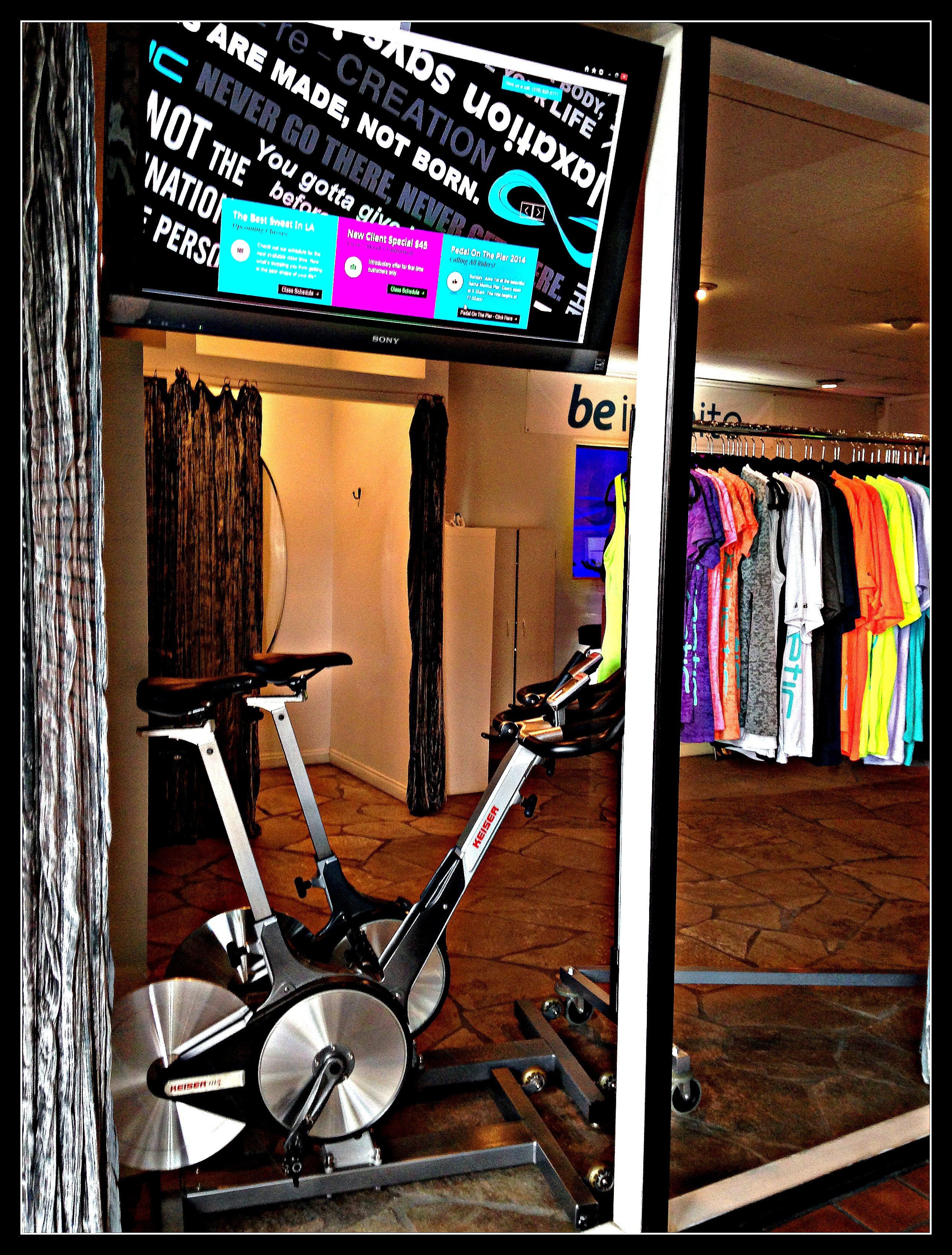 Walking in I was first greeted by the instructor who had to be one of the happiest people I have ever met! Upon learning it was my first time at the studio he proceeded to advise me that before we could do anything I needed to introduce myself first. After introductions he gave me a huge hug and smile. This of course put me right at ease and I was ready to get my spin on. Now what makes Kinetic Cycling stand out from other spinning studios out there is not the ambiance of the place, as walking in the ambiance is pretty bare bones and basic. Rather it is the premise of the class, spinning while the music video’s of the songs playing are streaming in front of you.