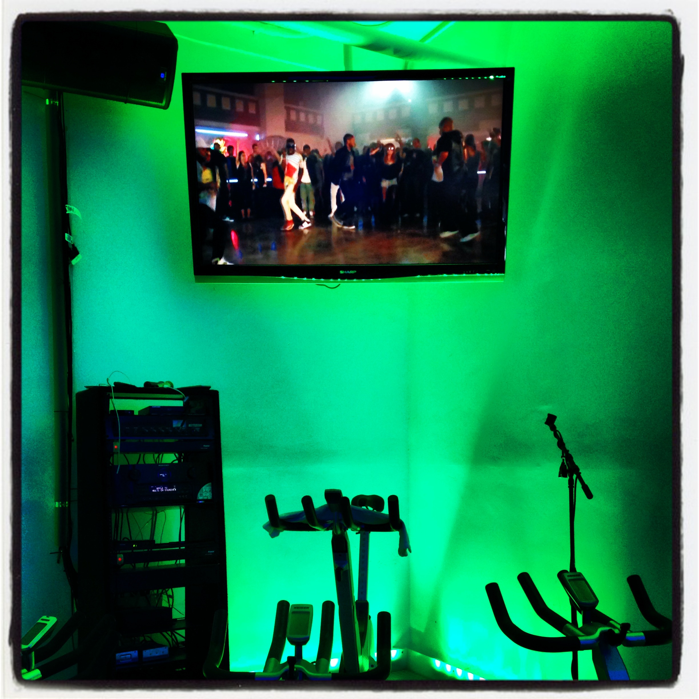 Once on my bike and the time hit 9:30 the music came on and Usher was all of a sudden singing and dancing in front of me. The lights started to flash from hot pink, to blue, to green, to purple and continued in this fashion all throughout the 45 minute ride. In front of us our fearless leader started the charge and we were all immersed in the television screen behind him. Talk about a great way to zone out when you are starting those hills! After about 10 minutes into the ride and just when I thought our instructor could not get any more enthusiastic he all of a sudden jumped off his bike, grabbed a microphone, and preceded to walk around the room cheering us on and giving is high fives, talk about a great tactic to keep you motivated and engaged.